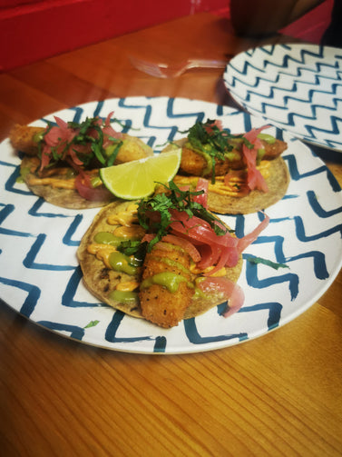 Three authentic corn tortillas topped with slow-cooked shredded. pork, salsa verde & pink onion.