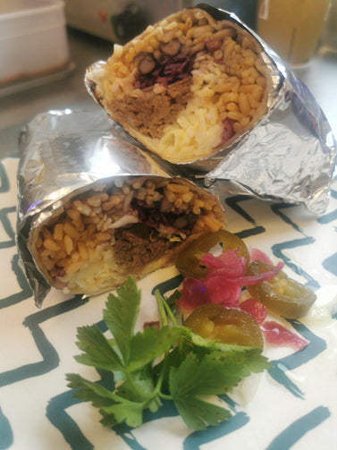 Shredded beef brisket in a toasted flour tortilla with Mexican rice, black beans, Mexican mixed cheese, slaw, pink onion, chipotle salsa & crema.